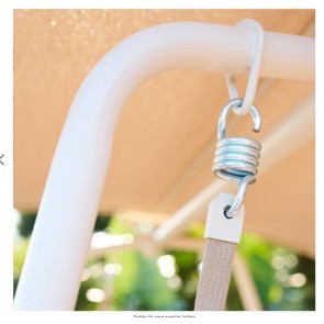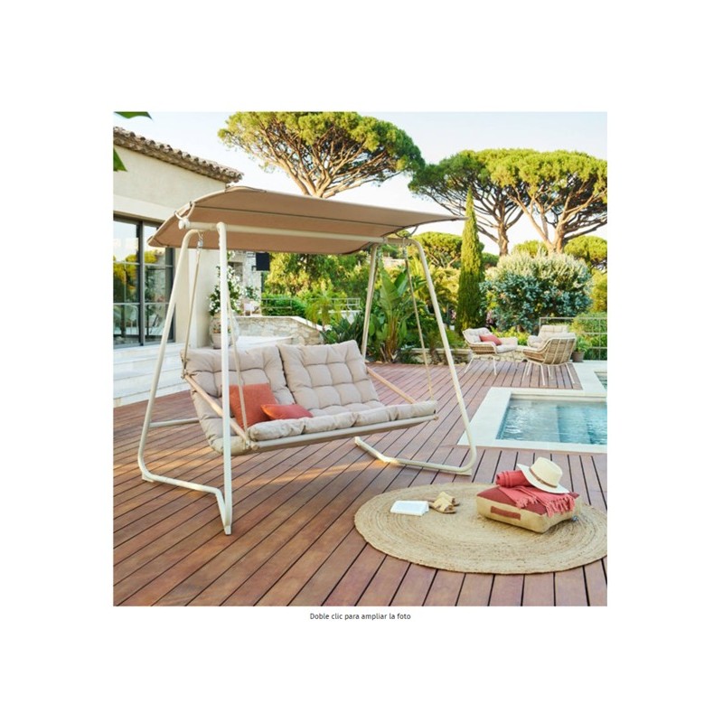 Ideal para acompañar pausas relajantes en una gran terraza o en un jardín, este columpio puede complementarse con una mesa auxiliar para colocar sus libros y bebidas. Puede combinarlo con una alfombra exterior y algunos cojines para crear un rincón decididamente acogedor.
