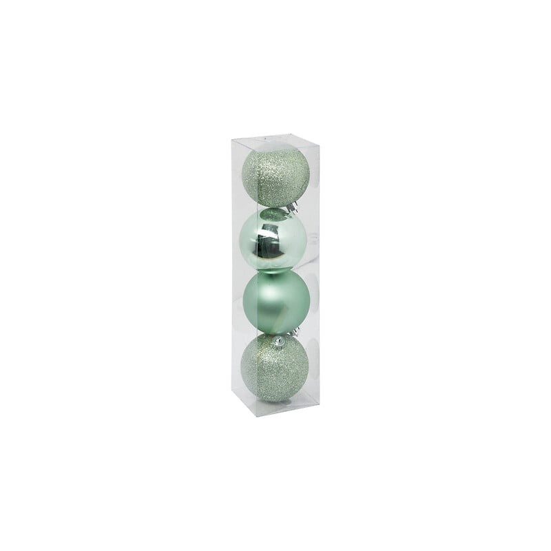 Navidad en verde almendra, suave y natural Este lote de 4 bolas de 8 cm en tono verde almendra aporta frescura y armonía a tu decoración. Perfectas para árboles grandes, centros de mesa o composiciones festivas con estilo moderno.