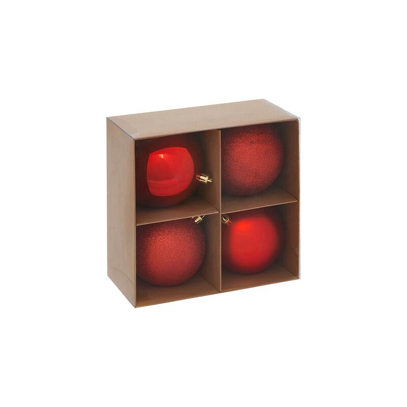 Lote de 4 bolas decorativas de 10 cm de diámetro, fabricadas en poliestireno reciclado, en color rojo. Aportan volumen, ligereza y un toque tradicional a cualquier composición navideña.
