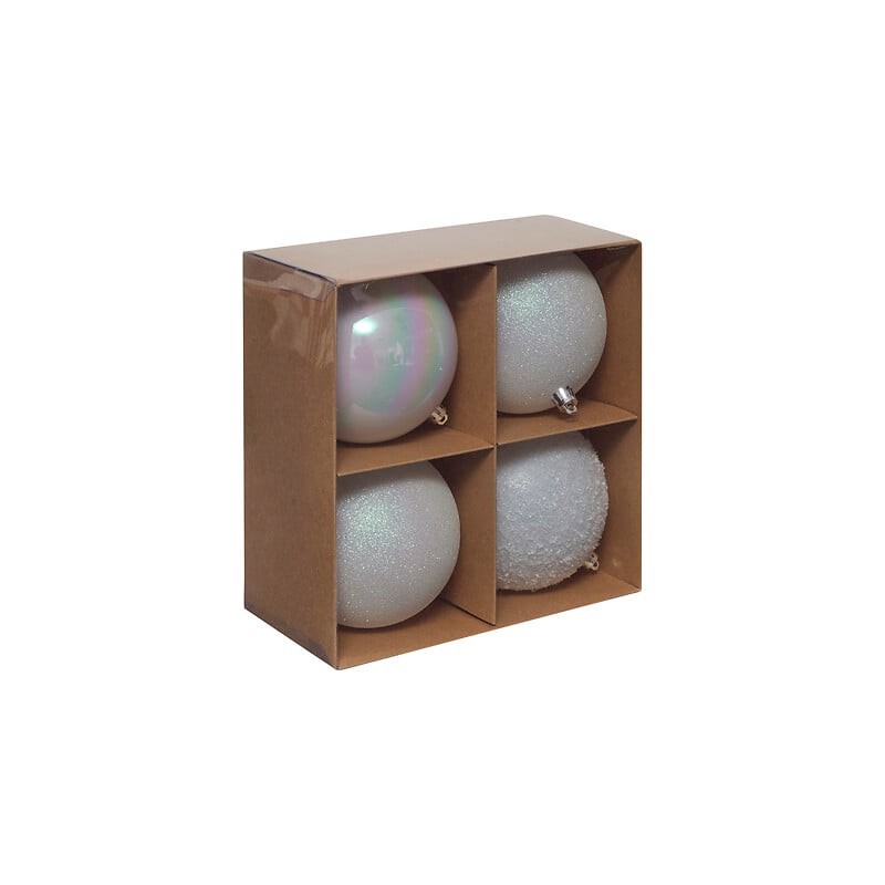 Juego de 4 bolas decorativas de 10 cm de diámetro en color blanco. Perfectas para árboles grandes, guirnaldas o composiciones festivas con un toque luminoso y versátil.