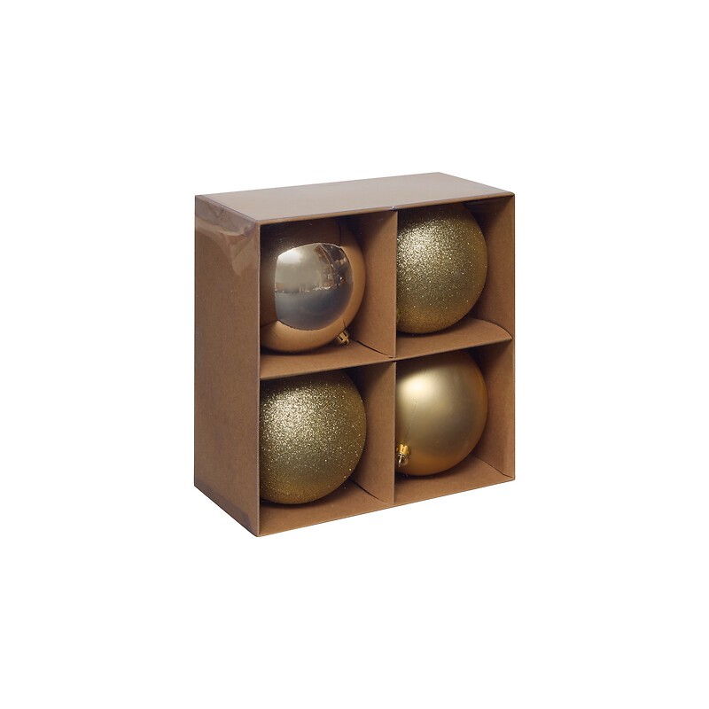 Juego de 4 bolas decorativas de 10 cm de diámetro en color dorado. Aportan volumen, luz y un toque festivo a árboles, guirnaldas o composiciones navideñas con estilo clásico.