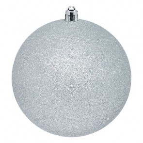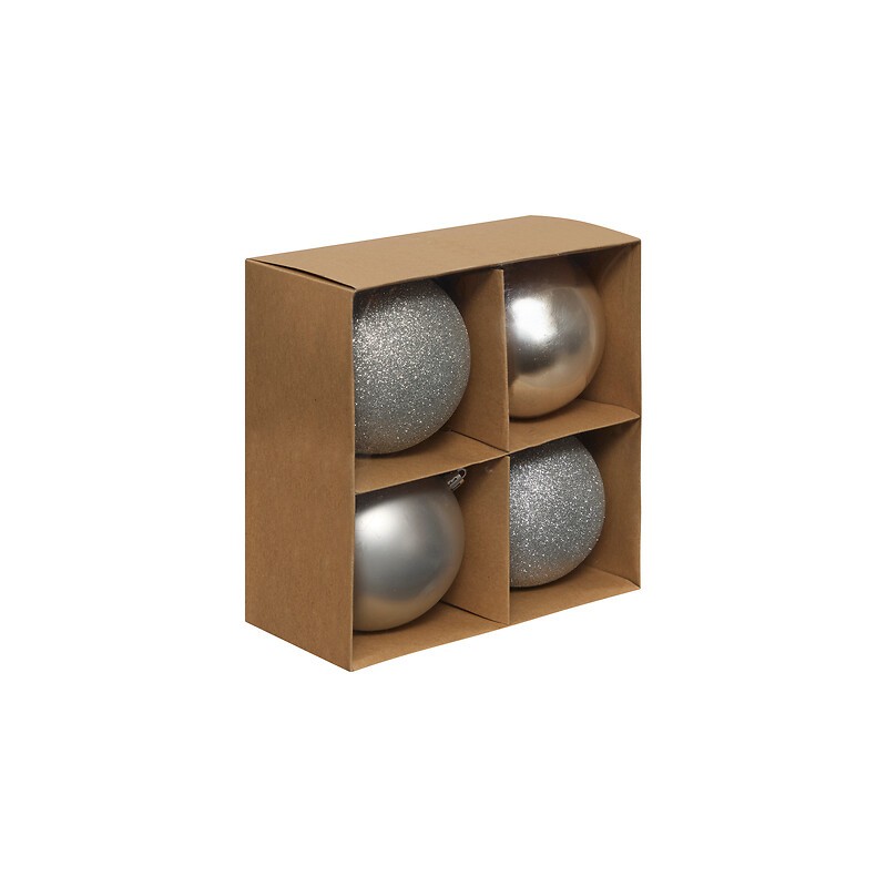 Lote de 4 bolas decorativos de 10 cm de diámetro, fabricados en poliestireno reciclado. Su acabado plateado aporta luz y volumen a composiciones navideñas sostenibles y sofisticadas.