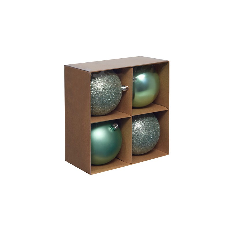 Lote de 4 bolas decorativas de 10 cm de diámetro, fabricadas en poliestireno reciclado, en color verde almendra. Aportan volumen, ligereza y un toque suave y sofisticado a cualquier composición navideña
