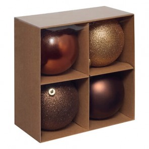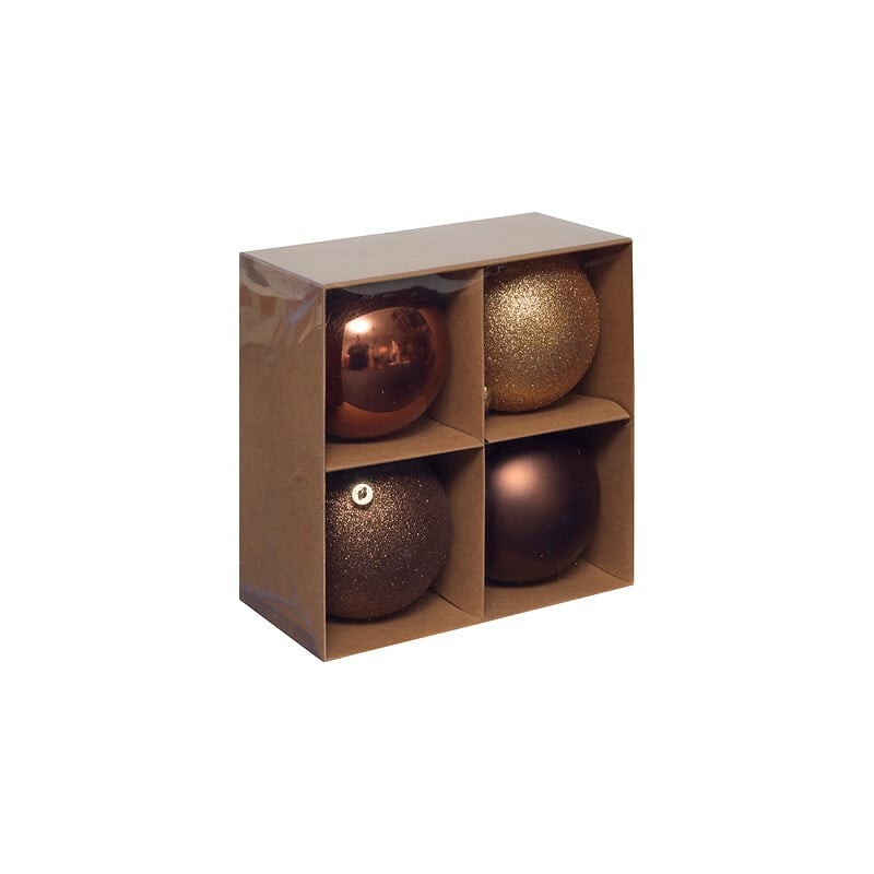 Tono cálido y sostenible para decorar Lote de 4 bolas decorativas de 10 cm de diámetro, fabricadas en poliestireno reciclado, en color bronce. Aportan volumen, ligereza y un toque sofisticado a cualquier composición navideña.