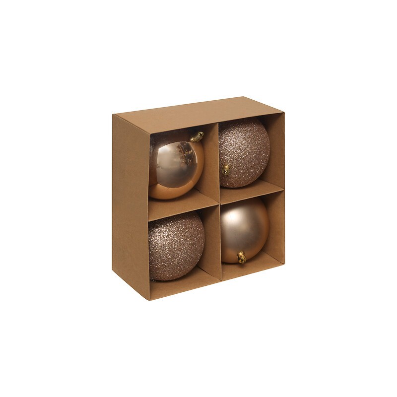 Lote de 4 bolas decorativas de 10 cm de diámetro, fabricadas en poliestireno reciclado, en color nude. Aportan volumen, ligereza y un toque delicado y contemporáneo a cualquier composición navideña.