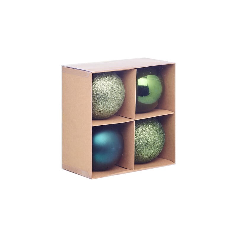 Lote de 4 bolas decorativas de 10 cm de diámetro, fabricadas en poliestireno reciclado, en color verde oliva. Aportan volumen, ligereza y un aire sofisticado a composiciones navideñas con estilo orgánico y actual.