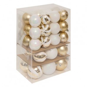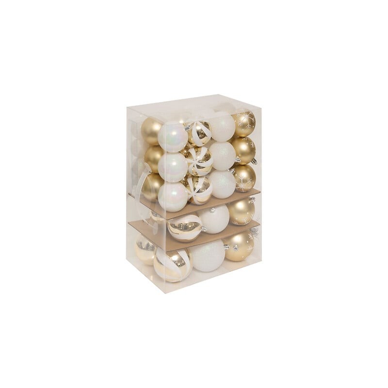 Lote de 60 bolas decorativas en poliestireno reciclado, con diámetros surtidos y acabados en dorado y blanco. Aportan volumen, contraste y un toque luminoso a árboles, escaparates o composiciones navideñas sostenibles.