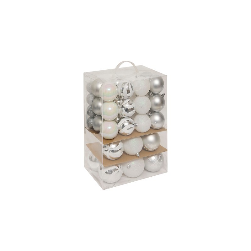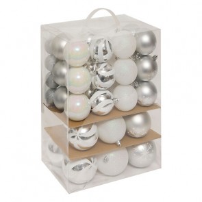 Lote de 60 bolas decorativas en poliestireno reciclado, con diámetros surtidos y acabados en plateado y blanco. Ideales para árboles grandes, escaparates o composiciones navideñas con contraste, ritmo y conciencia ecológica.