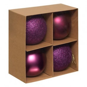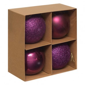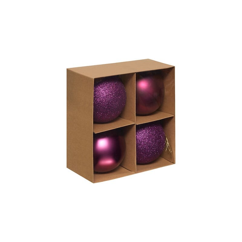 Lote de 4 bolas decorativas de 10 cm de diámetro, fabricadas en poliestireno reciclado, en color violeta. Aportan volumen, ligereza y un toque original y refinado a cualquier composición navideña.