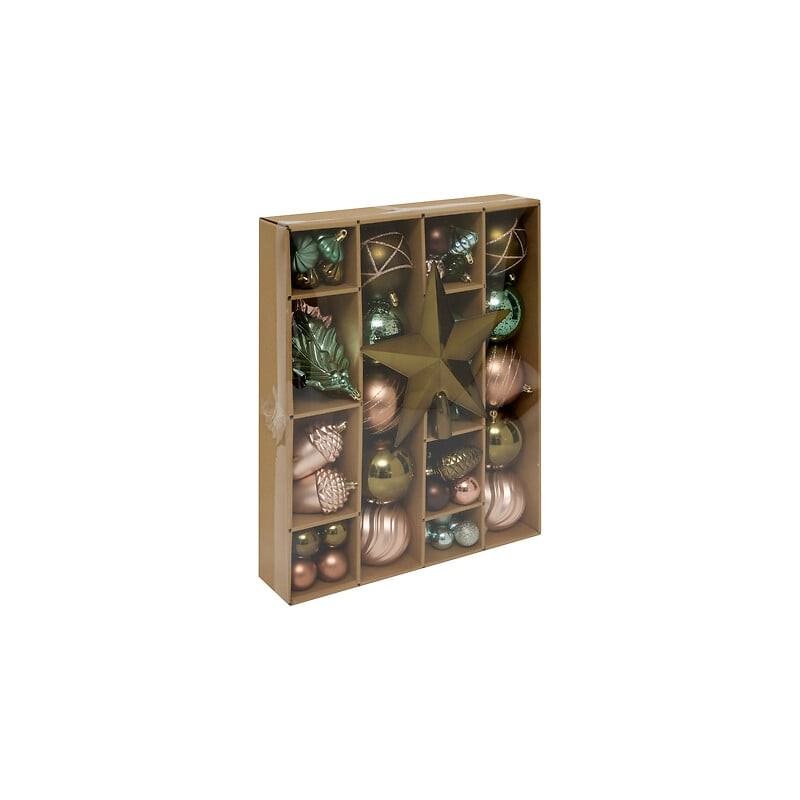 Kit de 60 piezas decorativas para árbol en la gama “Secretos del Bosque”. Incluye bolas, figuras y adornos en tonos verdes, tierra y acabados mate y brillantes. Ideal para crear una atmósfera serena, envolvente y sostenible.