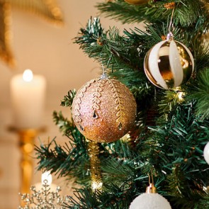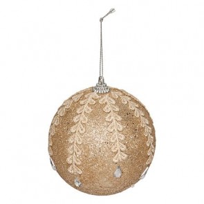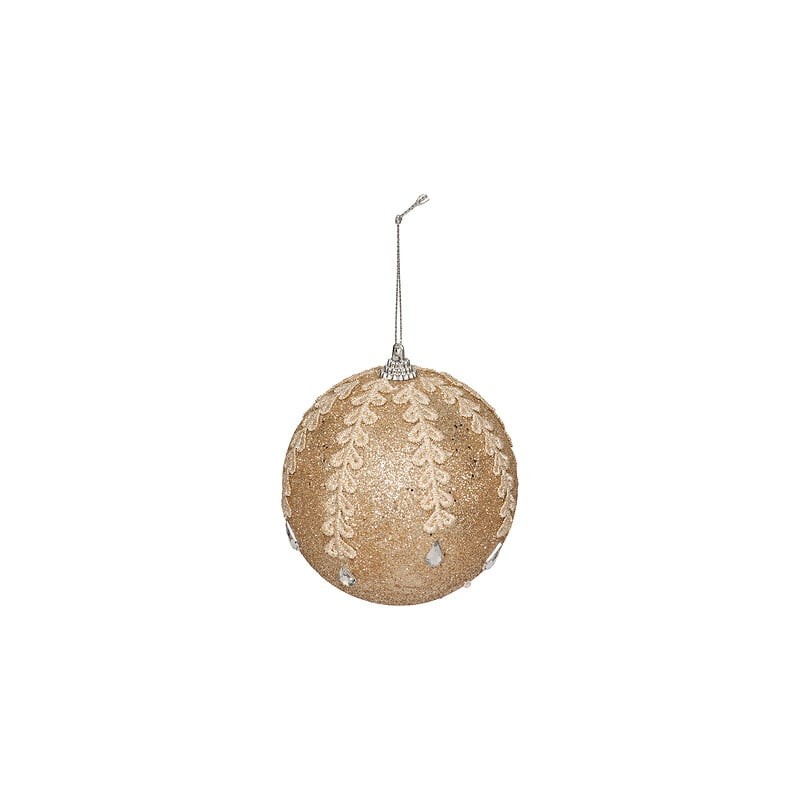 1 bola decorativa de 10 cm de diámetro en poliestireno, con bordados en relieve y acabado champaña. Aporta textura, volumen y un toque sofisticado a composiciones navideñas con estilo clásico o romántico.