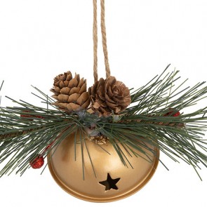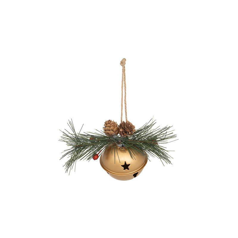 Figura decorativa de cascabel con piña en acabado metálico dorado, con diámetro de 6,5 cm. Su diseño compacto y brillante aporta un toque festivo y elegante a cualquier composición navideña. Ideal para añadir luz, textura y sonido a decoraciones con encanto clásico.