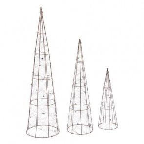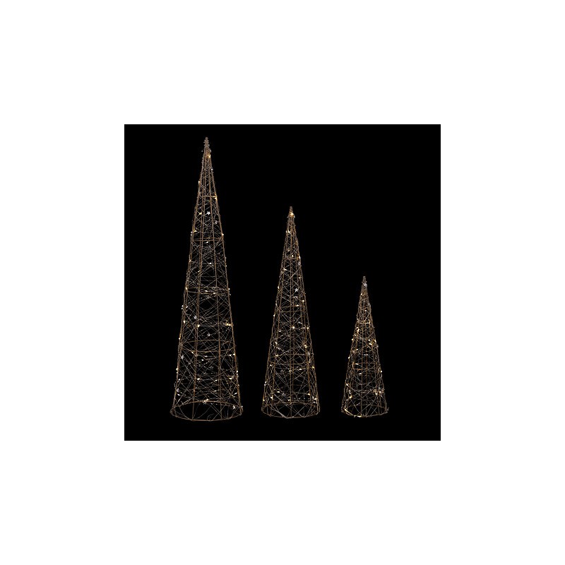 Este juego de 3 conos de luz LED con acabado cobre y 80 cm de altura aporta un toque cálido y sofisticado a la decoración navideña. Con iluminación blanco cálido, es ideal para crear composiciones luminosas tanto en interiores como exteriores cubiertos.
