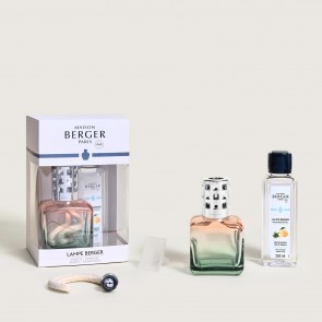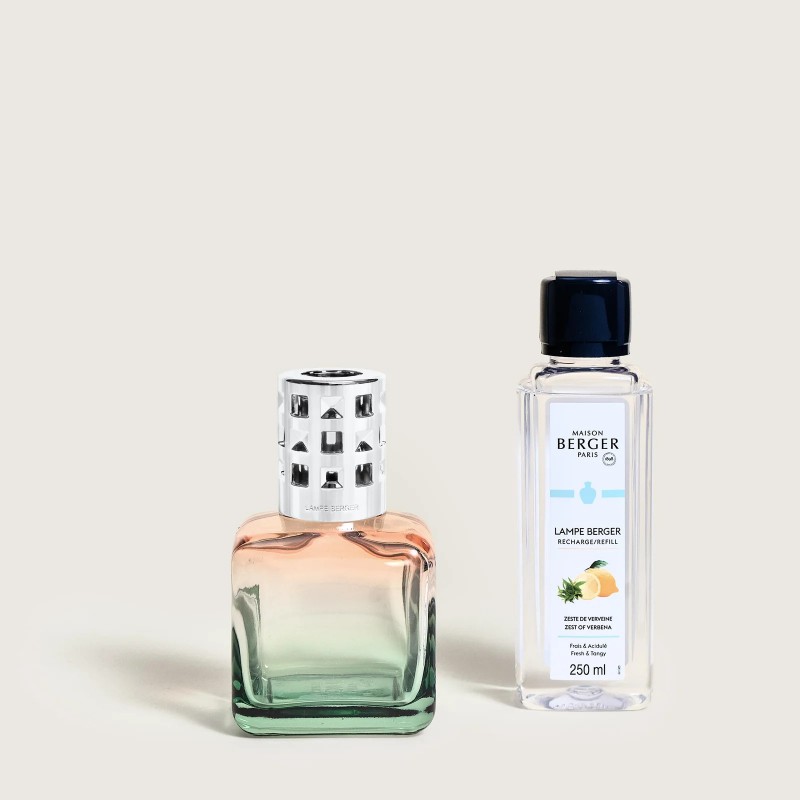 Descubra la elegancia del tie-dye Pêche/Verte y la frescura del perfume Zeste de Verveine en este cofre lámpara Berger.