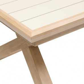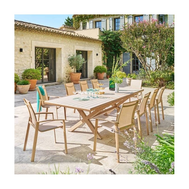 Esta mesa combinará perfectamente con sillas o sillones de jardín con detalles de efecto madera para formar un conjunto acogedor y cálido. Para completar este espacio de comedor, elija un gran parasol descentrado o colóquelo bajo una pérgola y disfrute de momentos de compartir protegidos del viento y del sol.