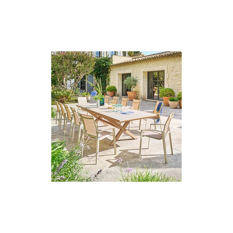 La mesa de jardín extensible "AXIOME" se destaca por su sólida base en forma de X y su estructura de aluminio con efecto madera. Su amplia superficie rectangular con listones puede acomodar hasta 12 personas una vez que se despliega la extensión automática, y las patas son ajustables para compensar las irregularidades del suelo, asegurando una estabilidad perfecta.