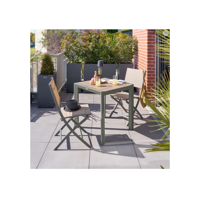 Con una estructura de aluminio teñido y un tablero de lamas efecto madera, disponible en un color contrastante, la mesa cuadrada "ÉVASION" apuesta por la elegancia. Diseñada para 2 personas, encontrará su lugar tanto en un balcón como en una pequeña terraza.