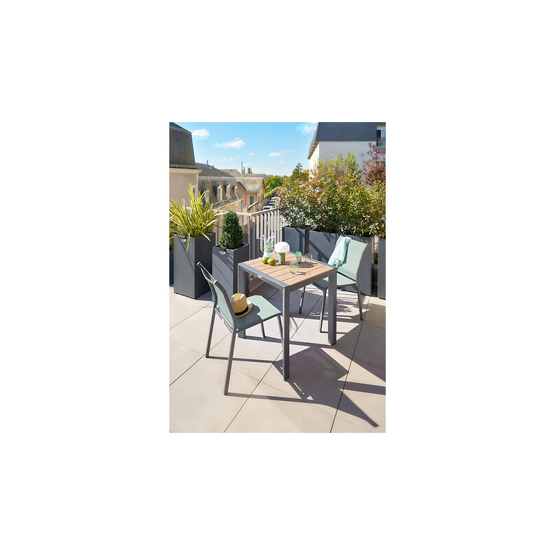 Con su estructura de aluminio teñido y su tablero de listones con efecto madera, disponible en un color contrastante, la mesa cuadrada "ÉVASION" apuesta por la elegancia. Diseñada para 2 personas, encontrará su lugar tanto en un balcón como en una pequeña terraza.
