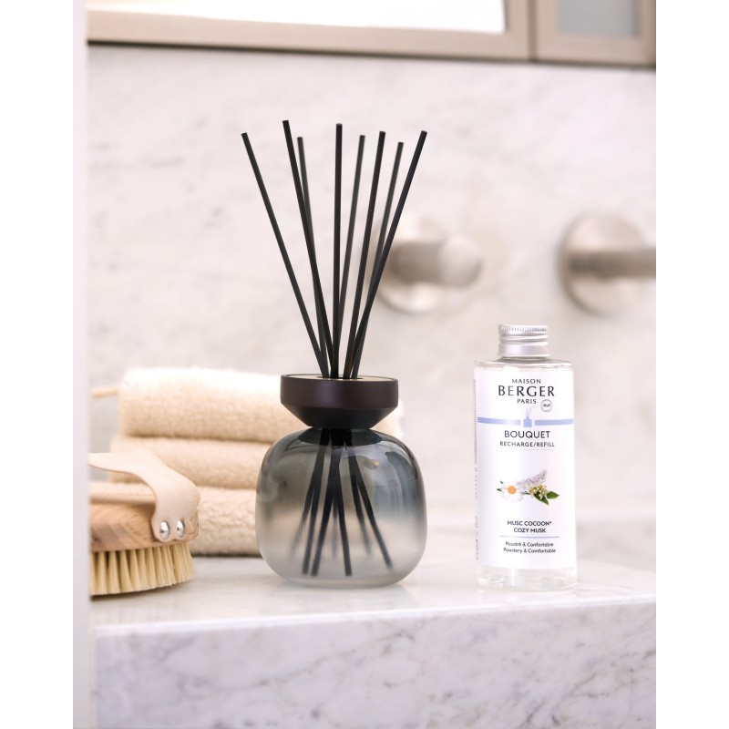 Realza tu interior con este Mikado en un frasco negro esmerilado y déjate envolver por la fragancia Cocoon Musk con notas de azahar, manzanilla romana y almizcles blancos.