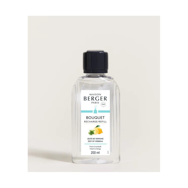 Zeste de Verveine es una fragancia fresca y cítrica. La nota de salida posee toda la chispeante frescura de la ralladura de cítricos, realzada por la faceta especiada de la pimienta rosa. El refinado corazón revela la naturalidad de las hojas de verbena, sutilmente subrayadas por la lavanda y la menta. Para dar redondez y elegancia a esta composición olfativa, Maison Berger la viste con un fondo suave y empolvado que combina ámbar gris con almizcles blancos. Toda la naturalidad y la chispa de la verbena recién recogida.