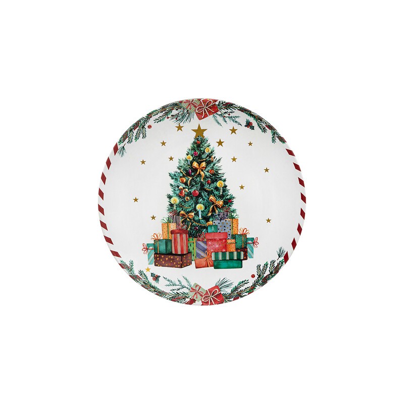 El plato de presentación “Regalo árbol de Navidad” de 33 cm de diámetro es ideal para vestir la mesa con un toque festivo y encantador. Su diseño navideño en forma de árbol y acabado decorativo lo convierten en una pieza perfecta para cenas especiales, escaparates temáticos o composiciones de mesa con espíritu navideño.
