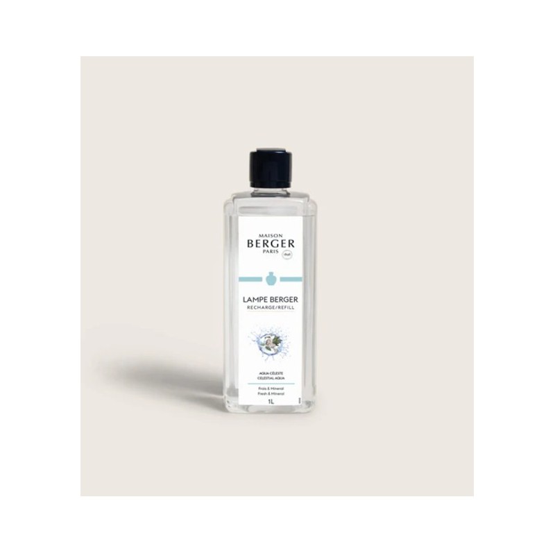 Recarga lámpara Berger Aqua Céleste 1 litro: brisa marina, naranja luminosa y fondo amaderado para un ambiente puro y sereno.