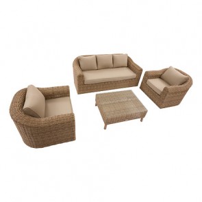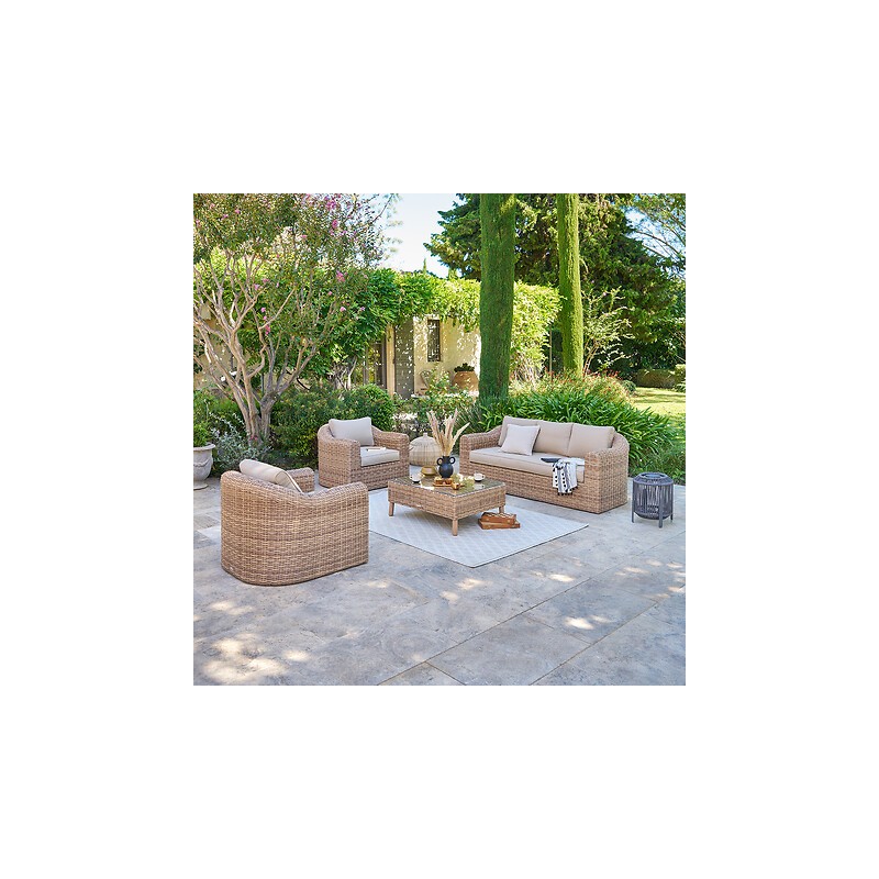 El conjunto de jardín "MOOREA" acogerá cómodamente a 5 personas gracias a un sofá y dos sillones, complementados por una gran mesa de centro. Este mobiliario se distingue por su estructura curva de aluminio epoxi, completamente revestida de resina trenzada con un acabado muy natural. Los asientos están acolchados con gruesos cojines extraíbles y las patas son ajustables para garantizar una perfecta estabilidad.