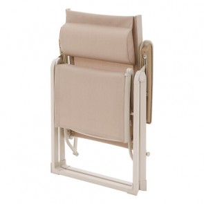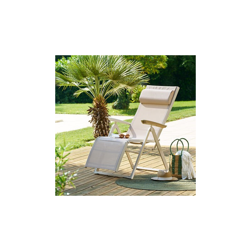 Con sus 8 posiciones de reclinación y reposabrazos, el sillón "DECIMA" es una creación de Hespéride que te acompañará en todos tus momentos de relax, desde pausas para leer hasta baños de sol. Equipado con un cómodo reposacabezas desmontable, está fabricado con una estructura de aluminio teñido y cuenta con un asiento de tela de textilene, flexible y resistente.