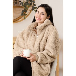 Manta con mangas en tejido Sherpa, con cremallera frontal y color beige lino. Diseñada para envolver con calidez y libertad de movimiento, es perfecta para relajarse en casa sin renunciar al confort. Su textura ultrasuave y diseño funcional la convierten en el complemento ideal para los días fríos, con un toque elegante y acogedor.