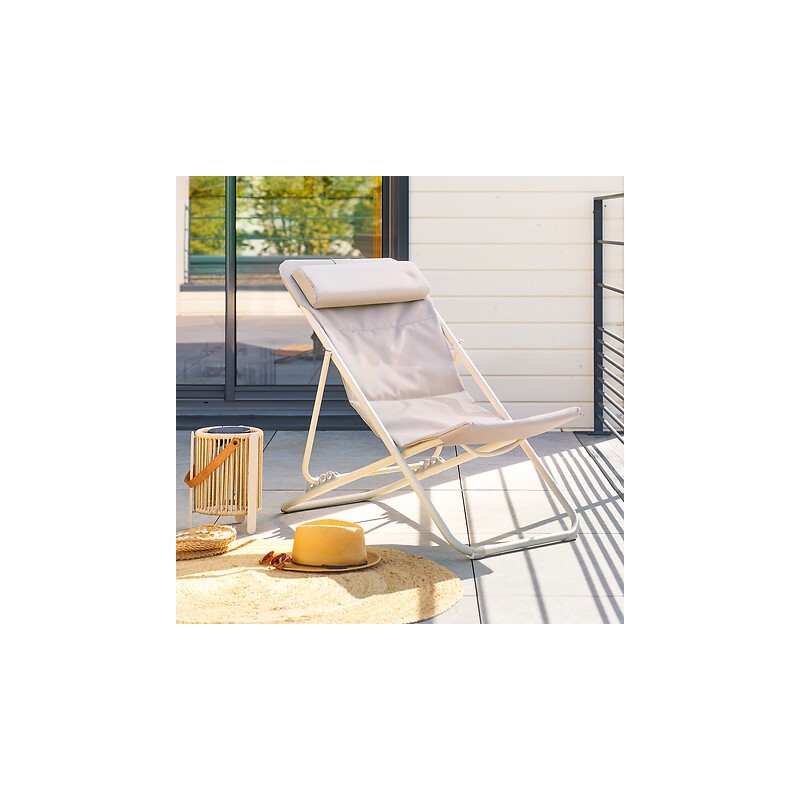 La tumbona "MIRAEL" está diseñada con una estructura plegable de acero que permite liberar espacio en el suelo una vez guardada. Está equipada con 3 posiciones de inclinación y dispone de un reposacabezas desmontable para ofrecerle momentos de relajación óptimos. Vestida con tela de textilene, un textil a la vez flexible y resistente, esta tumbona disponible en varios colores elegantes es un imprescindible para los días soleados.