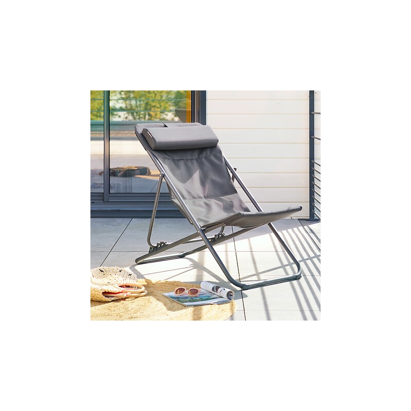 La tumbona "MIRAEL" está diseñada con una estructura plegable de acero que permite liberar espacio en el suelo una vez guardada. Está equipada con 3 posiciones de inclinación y dispone de un reposacabezas desmontable para ofrecerle momentos de relajación óptimos. Vestida con tela de textilene, un textil a la vez flexible y resistente, esta tumbona disponible en varios colores elegantes es un imprescindible para los días soleados.