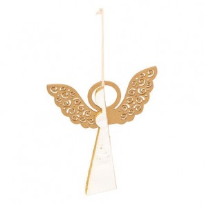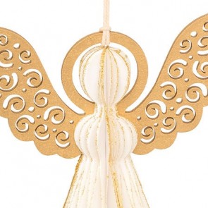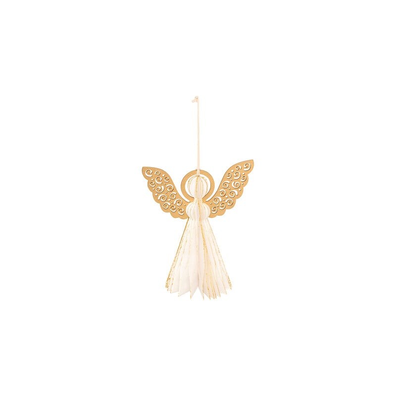 Esta figura de ángel con alas de papel en acabado dorado es un detalle delicado y luminoso para ambientar espacios con encanto festivo. Ideal para estanterías, mesas o composiciones navideñas con estilo artesanal.