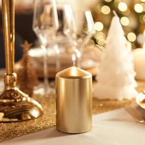 Esta vela redonda en tono oro es perfecta para añadir un toque cálido y sofisticado a tu decoración navideña. Su diseño elegante y su brillo satinado la convierten en un acento ideal para mesas festivas o rincones especiales.
