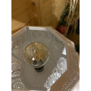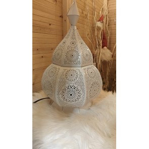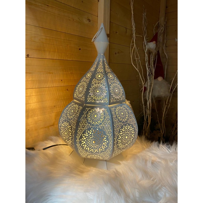 Lámpara decorativa de inspiración oriental, con un delicado trabajo calado que crea un juego de luces precioso cuando está encendida. Su diseño elegante y envolvente aporta calidez y un aire exótico a cualquier espacio, ideal para salones, dormitorios o rincones especiales.
