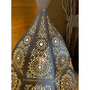 Fabricada en metal lacado en blanco, combina a la perfección con estilos boho, árabe, mediterráneo o nórdico cálido. Encendida, proyecta una luz suave y acogedora que transforma el ambiente.