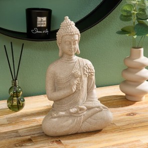 El Buda sentado Salma de 27 cm aporta serenidad y un toque decorativo elegante a cualquier espacio. Su diseño equilibrado y lleno de detalle transmite calma y armonía, convirtiéndolo en una pieza ideal para entradas, salones, zonas de relax o rincones zen. Su acabado cuidadosamente trabajado realza la expresión tranquila del Buda, creando una presencia decorativa que combina con estilos modernos, naturales o étnicos.