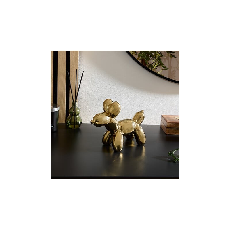 Figura decorativa en forma de perro, modelo Théo, elaborada en cerámica con acabado dorado. Su diseño estilizado y su tamaño compacto lo convierten en el complemento perfecto para estanterías, aparadores, mesas auxiliares o escritorios.