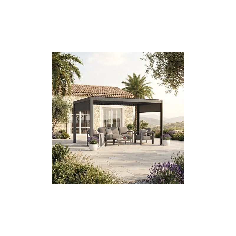 Transforma tu espacio exterior en un oasis de confort y diseño con la Pérgola Evonis Esta pérgola autoportante de 4 x 3 metros, con su elegante acabado en grafito, es la solución perfecta para disfrutar de tu jardín o terraza durante todo el año, combinando una estética moderna con una construcción pensada para durar.